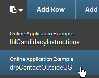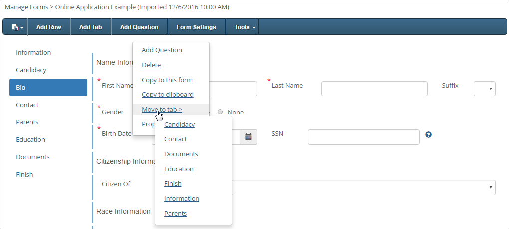 Rows can contain text, images, questions, and action buttons (described in the Questions section below). You can add multiple rows to a tab and move them according to how you want your questions ordered. Rows without content are removed when the page is refreshed. You can copy a row to the same form and/or copy a row to your clipboard where it can be pasted into another form.