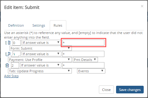 Tells FormFlow to execute the action if the answer value matches the value you specify. Rules must ALWAYS have an If answer value is condition in the first statement of the sequence. To execute the action if any answer is entered, or if you are setting the action to trigger when a button is selected, enter * in the answer value field. |