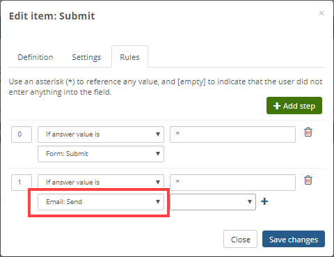 Rules consist of conditions, answers values, and actions. Example. To set up a rule, you must add it to a question or field. Rules must ALWAYS have an If answer value is condition in the first statement of the sequence.